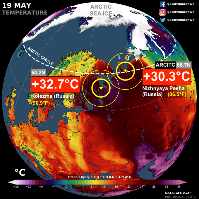 Serviciul norvegian de prognoze meteo yr.no spune că joi, 20 mai, temperatura va ajunge la 27 de grade în capitala regiunii autonome Neneția, Naryan-Mar, la Marea Barents. Mai la est, în Salekhard, pe râul Ob, vineri sunt așteptate temperaturi de 26 de grade. Salekhard se află, de asemenea, la Cercul Polar.