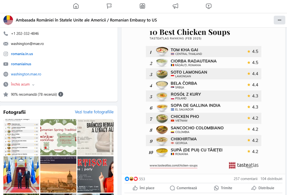 Recent, ambasada României la Washington a celebrat clasarea a două supe românești în topul celor mai bune supe din lume, conform Taste Atlas. Ciorba Rădăuțeană s-a clasat pe locul 2, iar supa de pui cu tăiței pe locul 10. Un motiv de mândrie culinară, fără îndoială. Dar oare acesta era cel mai important subiect de discutat pentru un diplomat de rang înalt în aceste zile?